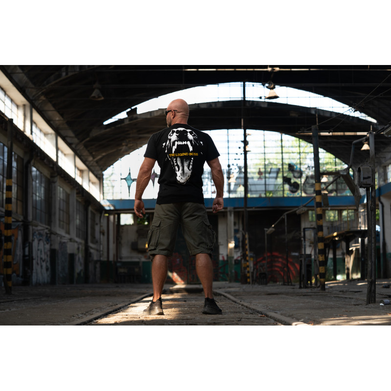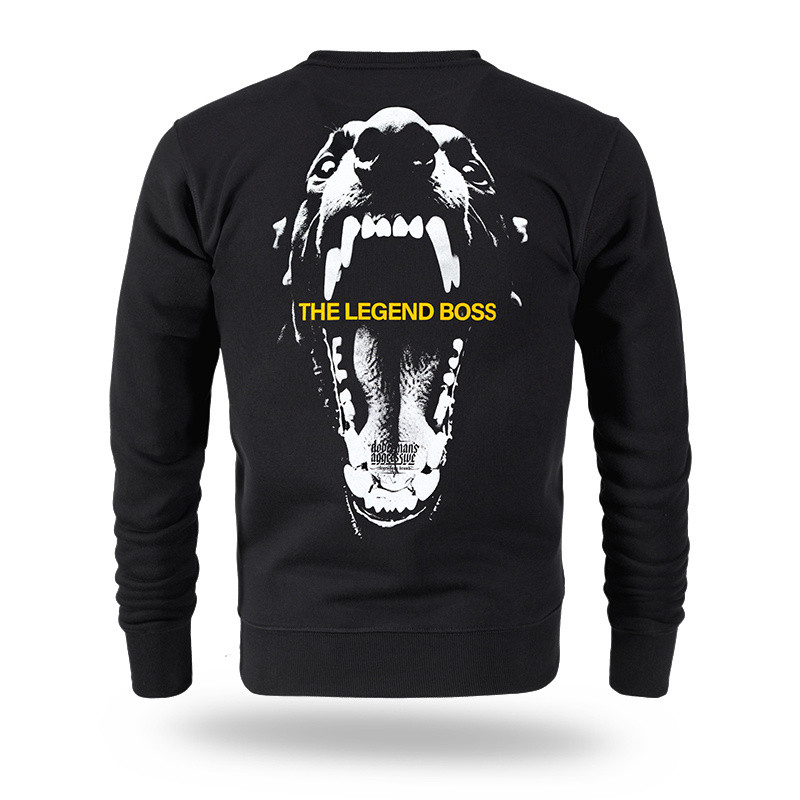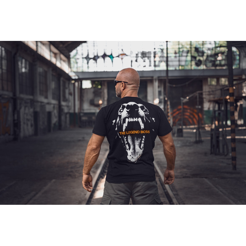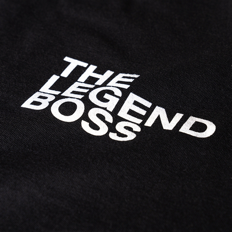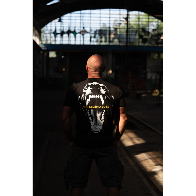 Na prsih se nahaja majhen napis “THE LEGEND BOSS”, na hrbtni strani pa izstopa atraktivna večja grafika odprtih pasjih čeljusti z izrazitim napisom “THE LEGEND BOSS” v kontrastni barvi. Ta kombinacija daje izdelku prepoznaven in drzen videz.