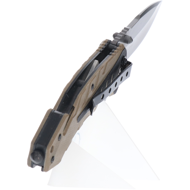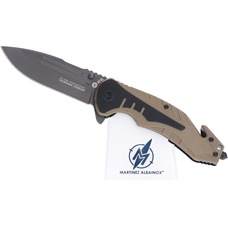 Nož K25 je trpežen taktični preklopni nož z jeklenim rezilom, titanskim premazom in Liner Lock sistemom za varno uporabo. Ročaj zagotavlja dober oprijem, medtem ko vgrajeni razbijalec stekla in rezalec za varnostne pasove povečujeta uporabnost v nujnih primerih. Priložen je najlonski etui z Molle sistemom za priročno prenašanje. Idealna izbira za preživetje, taktične naloge in vsakodnevno nošenje.