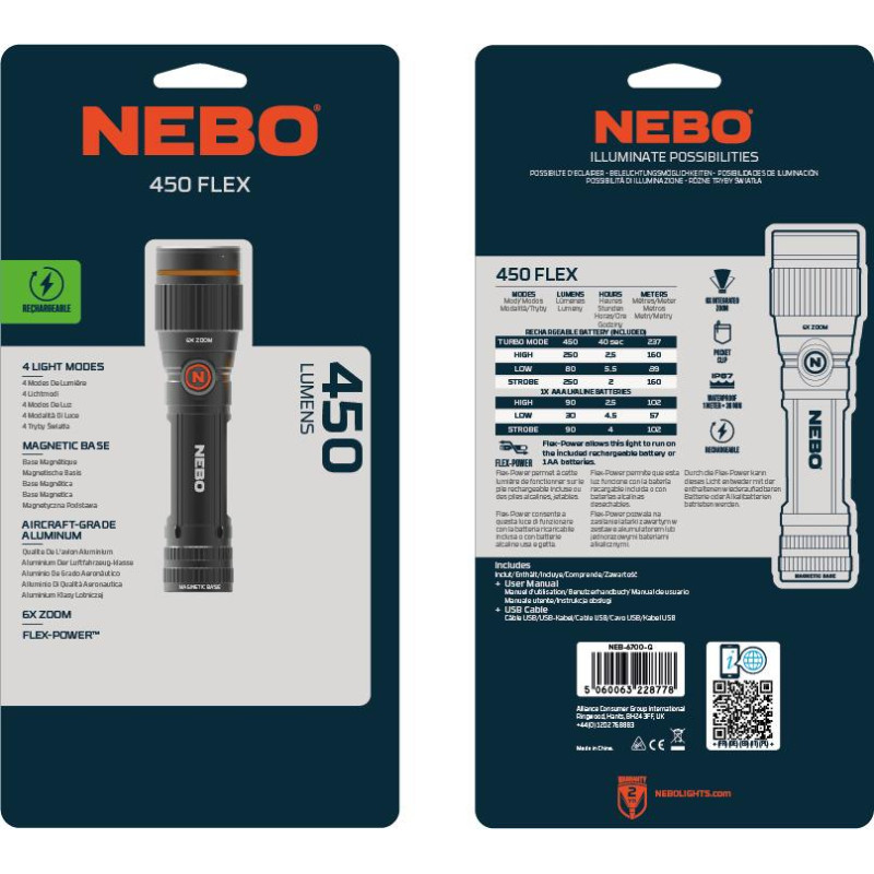 Nebo 450 Flex je ročna svetilka s 450 lumni svetilnosti in Flex-Power tehnologijo, ki omogoča napajanje svetilke z eno AA baterijo ali litij-ionsko 14500 polnilno baterijo. Odlikuje jo 6x zoom, ki vam omogoča, da svetilko izostrite in tako ponuja odlično vsestransko osvetlitev.
