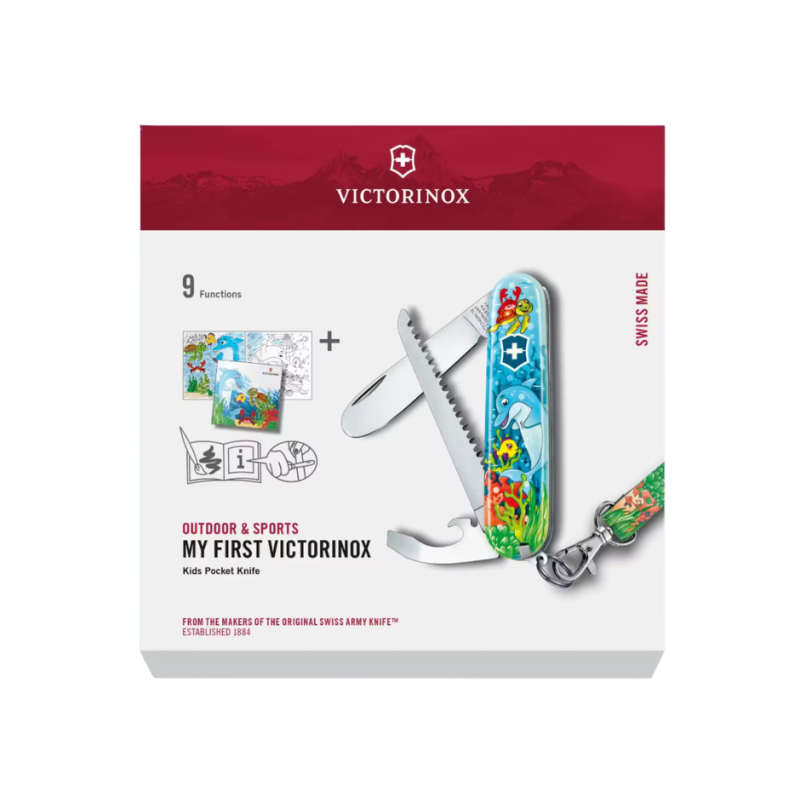 Victorinox My First Victorinox – Animal Edition je otroški žepni nož z 9 funkcijami in zaobljenim rezilom za varnejšo uporabo. Set vključuje tudi trak za nošenje in poučno pobarvanko, idealno za prve outdoor dogodivščine otrok pod nadzorom odraslih.